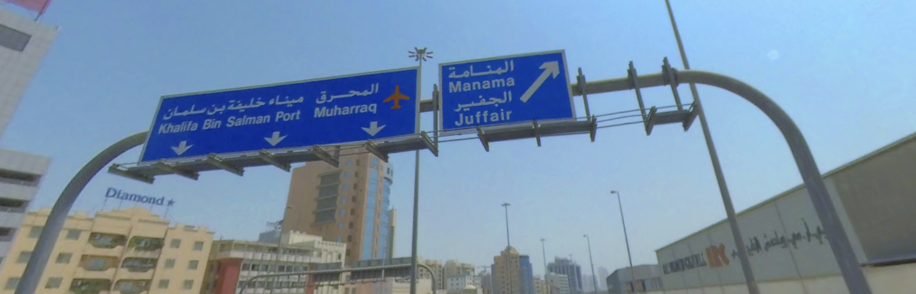 On Google Maps, similar signs near Manama, the national capital, clearly showed two languages (archived here) and were blue, not green: