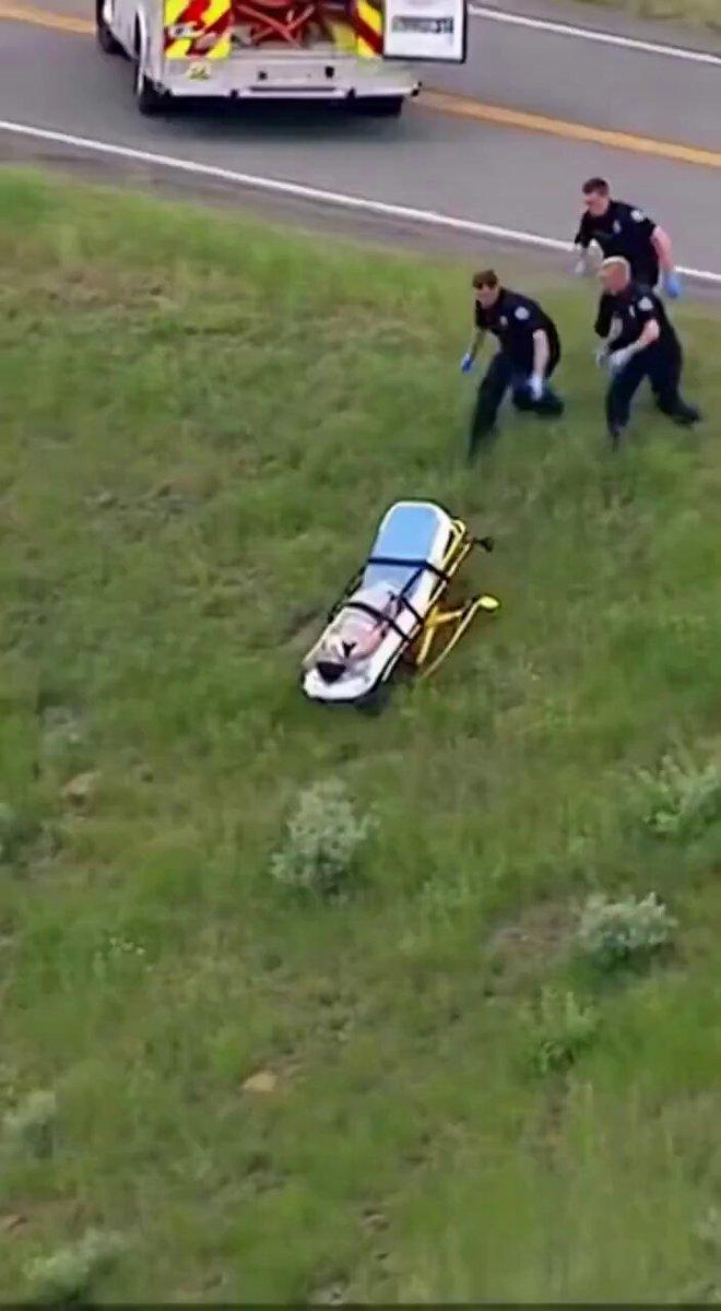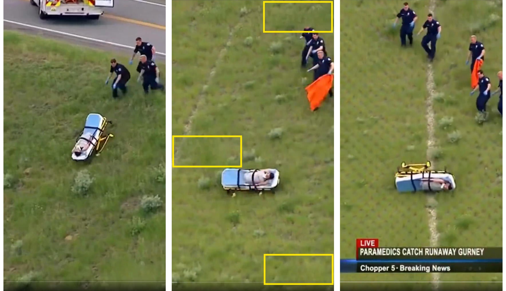 Did a news helicopter capture live footage showing a crew of paramedics chasing a runaway gurney as it careened down a grassy slope? No, that's not true: The scene featuring a fake "Chopper 5 - Breaking News" chyron is AI-generated. There are several clues that the video is not real. Three blurred areas in the video frame indicate the positions where AI watermarks were removed. Over the course of a few seconds the hillside morphs from rough grass and scrub into a playing field painted with a stripe and a precise grid of dark dots. Additional versions of this scene, likely generated with variations of the same AI prompt, have been published on social media.