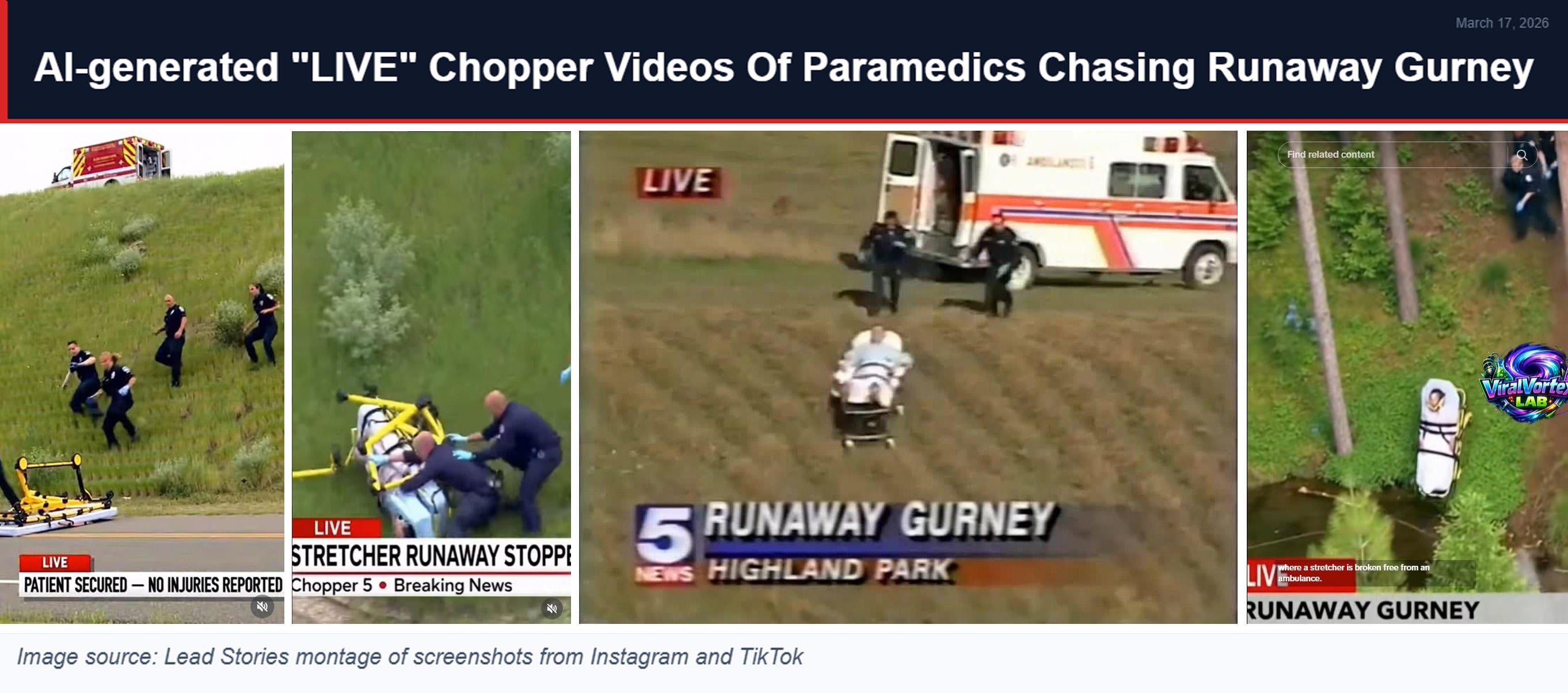 Lead Stories identified additional videos on Instagram and TikTok that appear to have been generated from the same prompt, or are copycats of the same theme (pictured below). These show not only the runaway gurney, but the fake chyron of a "Live" news helicopter broadcast. Two videos were posted on Instagram by the account @aironic.nl; one on Jan. 14, 2026, and another on Jan. 17, 2026 (archived here and here). Two similar videos were published on TikTok; one on Jan. 11, 2026, by @lipsforjits1, and another on Jan. 23, 2026, by @viralvortexlab (archived here and here).
