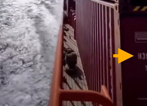 The video shows several telltale signs of AI generation. Along the right edge of the video frame is the dark shadow of the corner of the stack of containers. There are markings and lettering on the containers. In the opening seconds of the video the text "HC3" can be clearly made out, but the glitching letters flicker and shift position (below). The missiles appear suddenly at tremendous speed rather than gradually approaching from a distance.