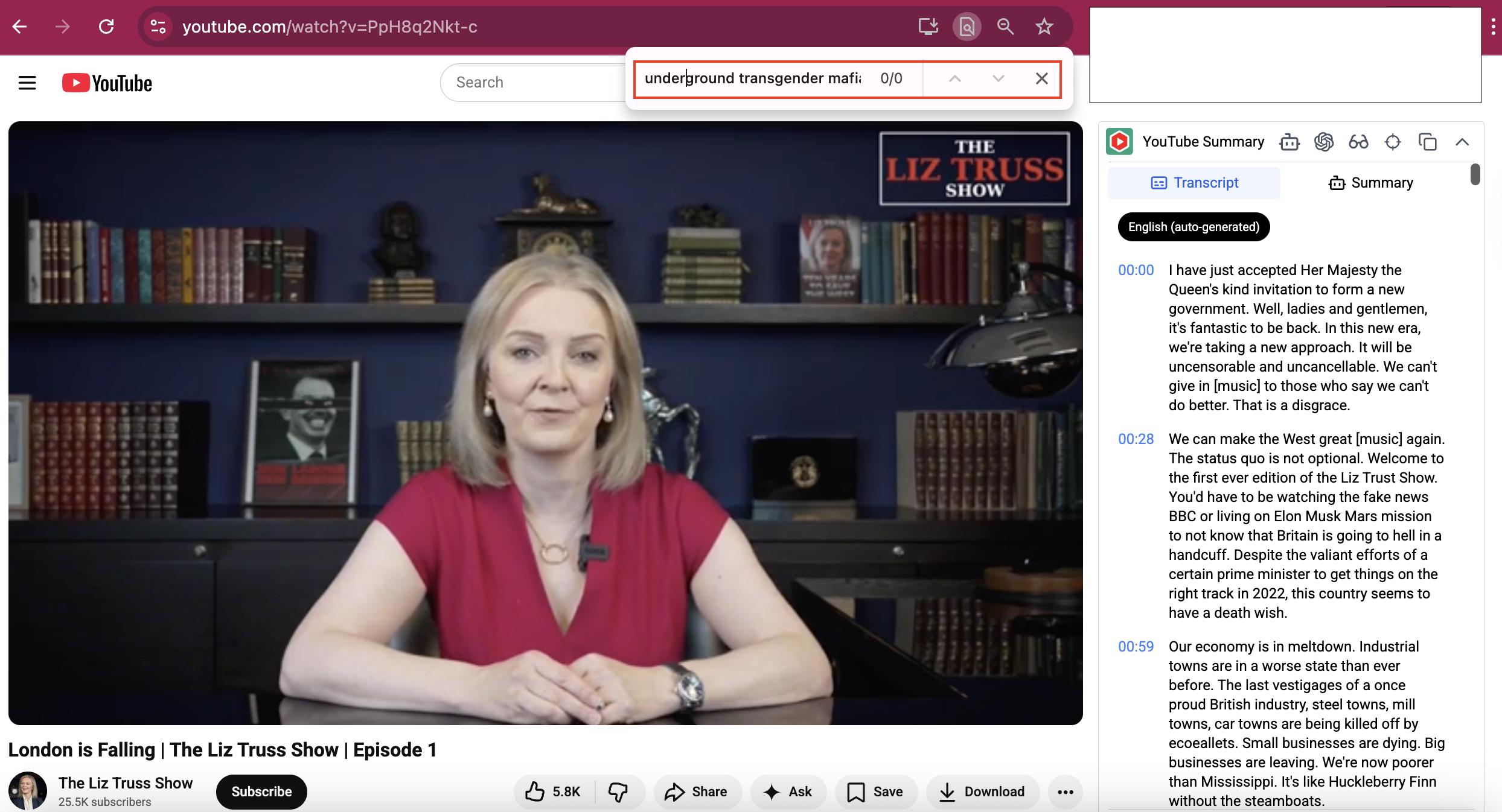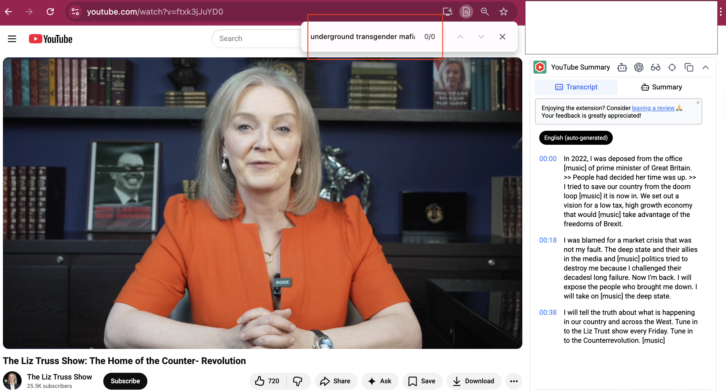 The screenshot that was reused in the post in question predated the chocolate heist by nearly four months. It came from the first episode of the former prime minister's show on YouTube (archived here) uploaded on that platform on December 5, 2025. According to the automatic transcription, she did not say anything about "underground transgender mafia" during the show's inaugural episode: