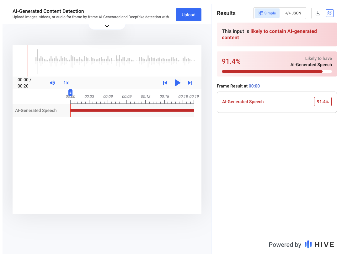 Hive Moderation, another AI detection tool, also said the probability of the audio being a product of generative AI was high. According to it, the odds of that were 91.4 percent:
