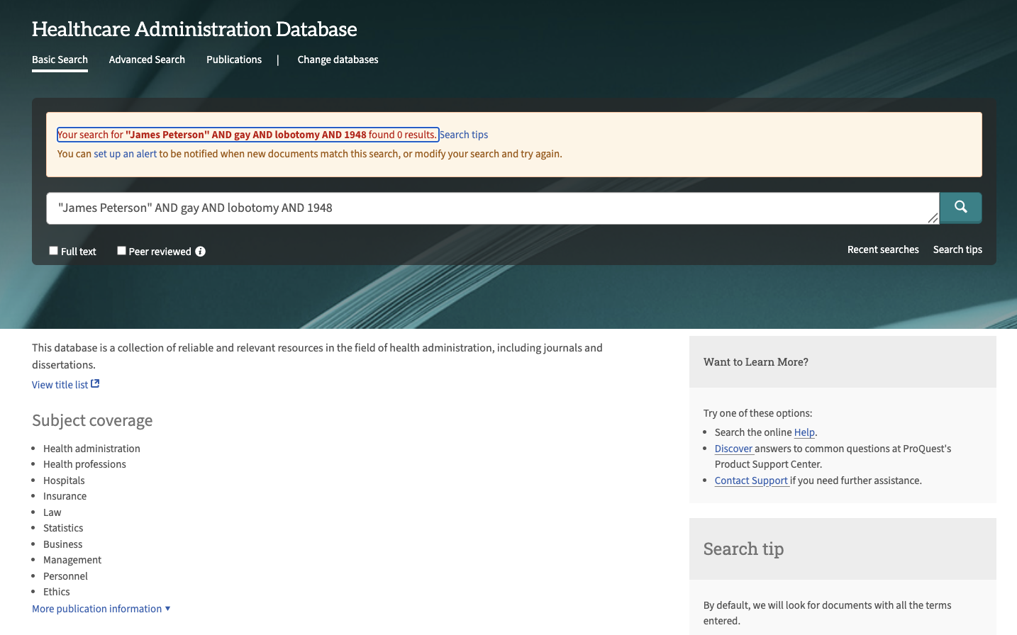 Lead Stories searched multiple databases from the list of resources available (archived here) to the alumni community. That included Academic Search Premier, Directory of Open Access Books, JSTOR, Journals of the American Medical Association (JAMA), MIT Press Direct, ProQuest Health Management, ProQuest Medical Library and ProQuest U.S. Newsstream.