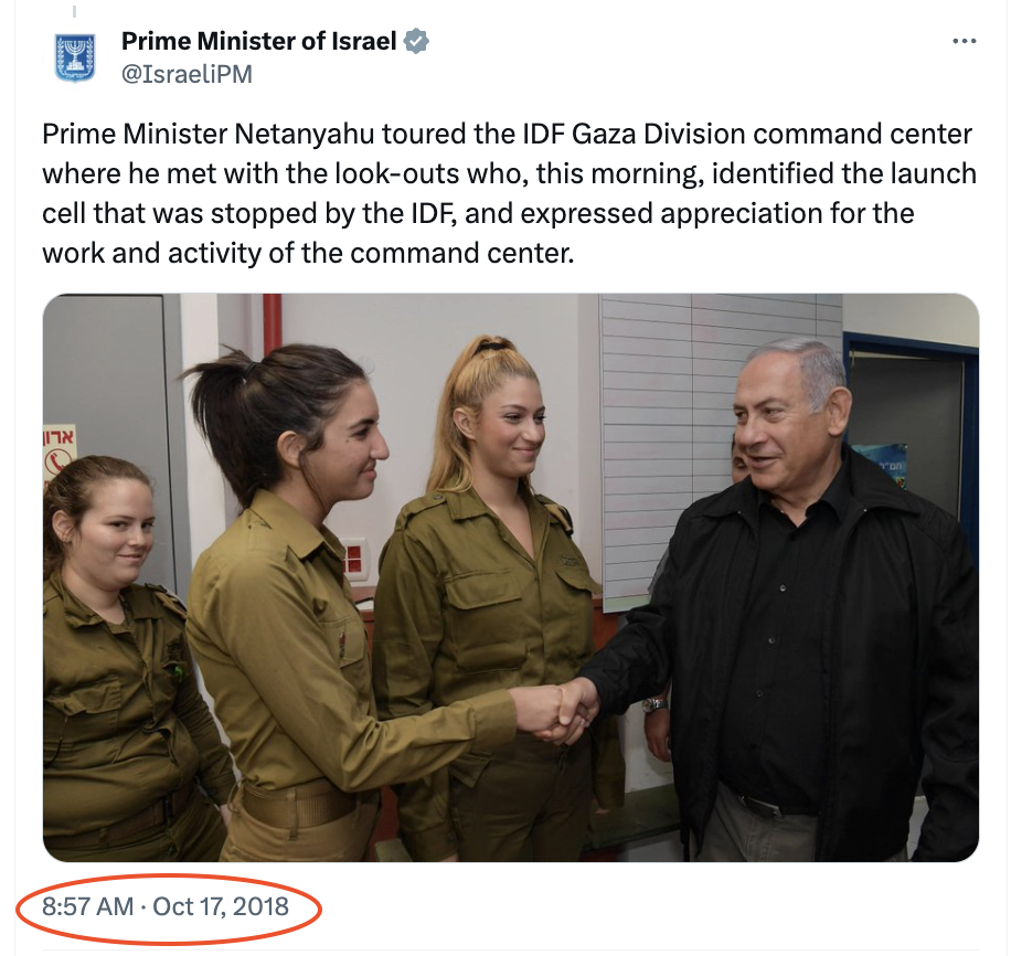 The earliest example of the image's use appeared on Netanyahu's official X account, where it was posted in October 2018 (archived here). The photo predated the Oct. 7, 2023, Hamas attack on Israel by five years, and the Feb. 28, 2026, U.S.-Israeli attack on Iran -- which killed its longtime ruler Ayatollah Ali Khamenei -- by roughly seven and a half years.