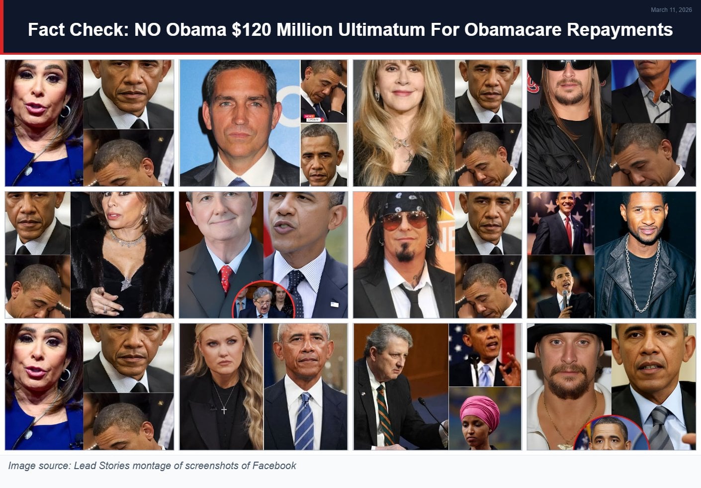 Did various politicians and celebrities all hand down a "verdict" for a "$120 million ultimatum" to former President Barack Obama over repayments related to Obamacare? No, that's not true: Several such stories naming people as diverse as Jeanine Pirro, Jim Caviezel, Kid Rock and Stevie Nicks issuing the ruling were posted by a network of foreign-run Facebook pages. The story was largely copy-pasted, swapping out the main character each time, often still describing the men as handing down "her verdict". There were no actual news stories about such a ruling.