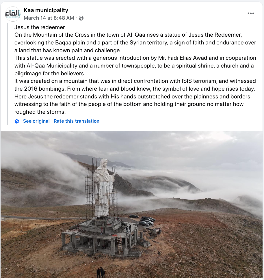 Is a video showing a statue of Jesus the Redeemer being erected on the Mount of the Cross in Al-Qaa, Lebanon, real? Yes, that's true: The video shows the installation of a statue of Jesus the Redeemer in the Lebanese village of Al-Qaa in the Bekaa Valley. Lebanese media reported that the statue was erected in March 2026 on Jabal al-Salib (Mount of the Cross), overlooking the Bekaa plain and the Syrian border. Several online detection tools rated the video as likely not AI-generated.
