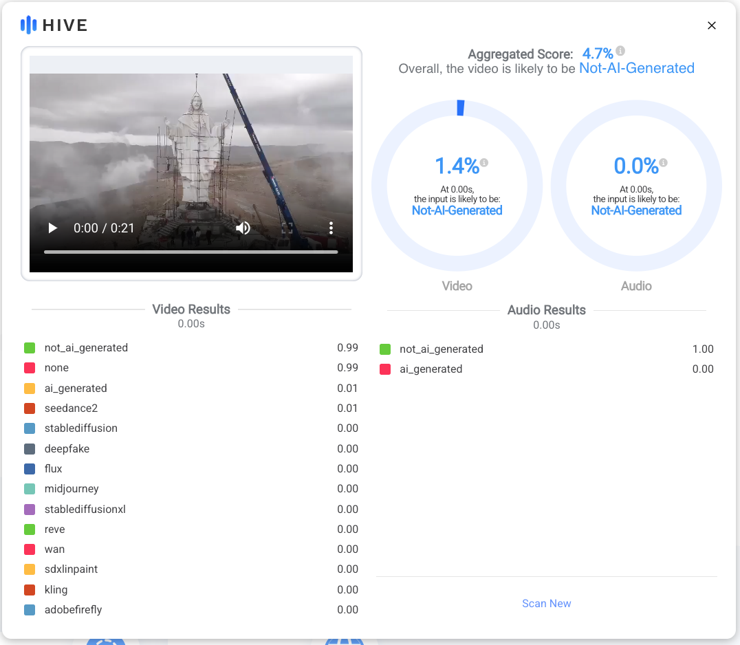 A second tool, Hive Moderation AI-Generated Content Detection, concluded the video was "likely not AI-Generated" with an aggregated score of 0.0%. The higher the score, the greater the AI content: