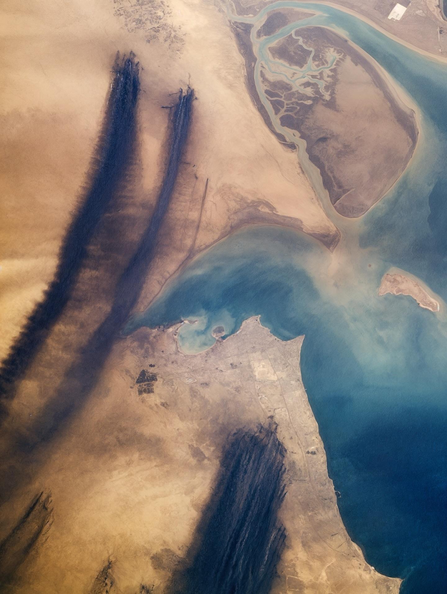 The effects of Iraq dictator Saddam Hussein's setting fire to the oil wells in Kuwait during February 1991 is graphically captured in this near-vertical photograph of the northwestern end of the Persian Gulf. The black smoke plumes of more than 700 individual oil well fires are being blown to the south. Kuwait City is located on the south side of Kuwait Bay, southwest of the Tigris-Euphrates Delta. Fortunately, the oil well fires were extinguished in much less time than had been originally predicted, and the environmental damage created by the fires and smoke was mostly confined to the immediate region around the northwestern Persian Gulf. (Refer to STS-046-074-094 for a photograph of the same area to see how quickly the desert is reclaiming the land in this region.)