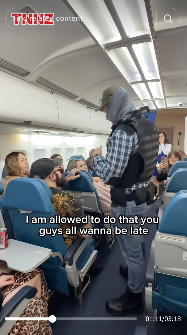 The video opens with a chyron, "TTNZ," that imitates a news outlet. It shows a person wearing a bulletproof vest and a badge on a chain around their neck, with their face covered, asking for a passenger named Juan Garcia to identify himself. A flight attendant wearing sneakers, with no uniform bearing a discernible logo, points out a person in a seat. The video ends with the man on the floor in handcuffs, saying he is a U.S. citizen.