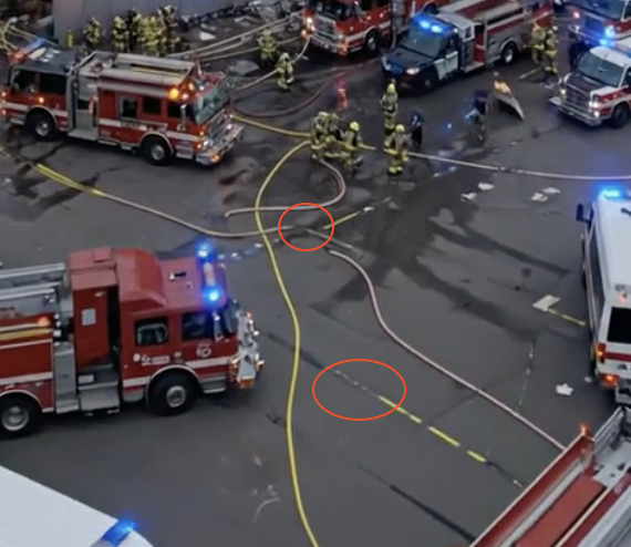 Fire hoses seamlessly blended in with the asphalt: