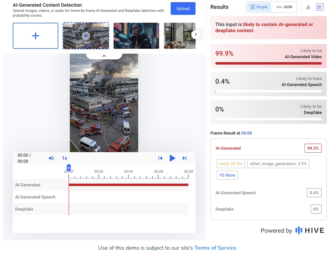 Lead Stories ran the video through Hive Moderation's AI-generated content detection tool. It concluded that the clip was 99.9% likely to have been created by generative AI: