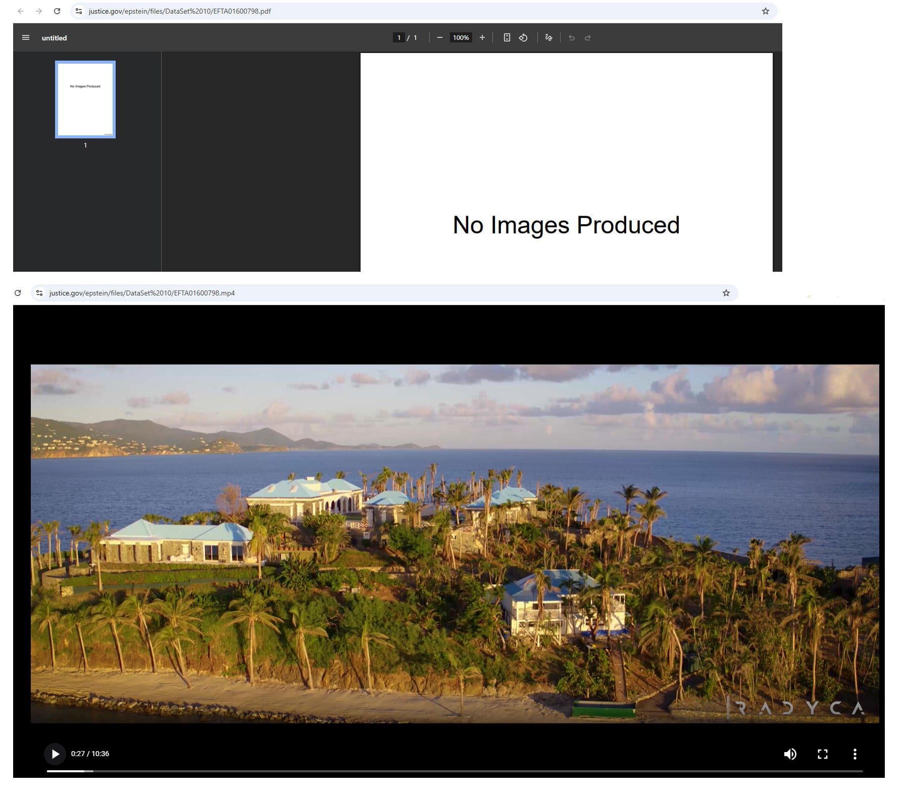 For this example Lead Stories used a real Epstein file video, aerial footage of Little Saint James Island. Some of the about 2,000 videos in the Epstein files are redacted; they may contain commercial pornography, explicit material, or criminal sexual abuse. It is not possible to simply browse through all the videos. The DOJ has provided this caution: