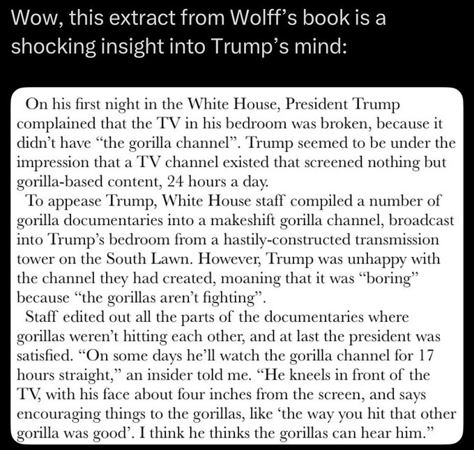 Does a viral screenshot deliver a real extract from Michael Wolff's book about U.S. President Donald Trump demanding a "gorilla channel" in the White House? No, that's not true: It's an old joke that first emerged in January 2018 as a response to the revelations in Michael Wolff's 'Fire and Fury.' Lead Stories confirmed that the book contains no mention of gorillas.