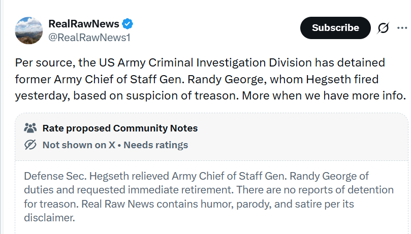 Per source, the US Army Criminal Investigation Division has detained former Army Chief of Staff Gen. Randy George, whom Hegseth fired yesterday, based on suspicion of treason. More when we have more info.