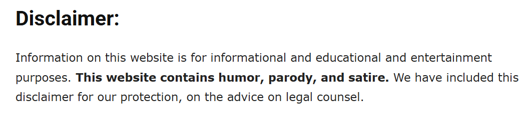 Information on this website is for informational and educational and entertainment purposes. This website contains humor, parody, and satire. We have included this disclaimer for our protection, on the advice on legal counsel.