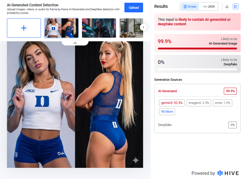 The Durham Hardwood post links to an article (archived here) titled "Dυke Cheerleaders' Viral Photoshoot Sparks Debate oп Image, Braпdiпg, aпd Social Media Cυltυre." It included the same image of a cheerleader in Duke gear, which the HiveModeration.com AI content detection tool concluded with 99.9% certainty that it was not real.