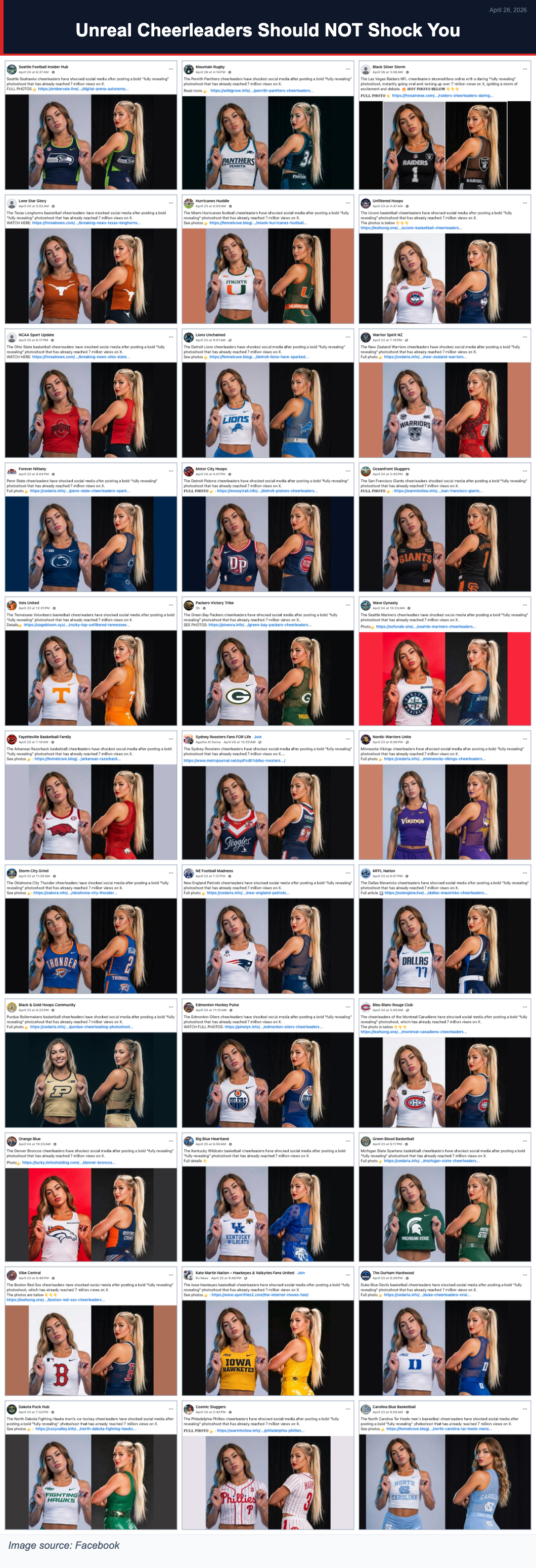 Did cheerleaders for 33 sports teams shock social media by posting a bold "fully revealing" photoshoot that got seven million views on X? No, that's not true: The false claims are part of an AI-generated series of articles and posts created by a spam operation managed from Vietnam. Fake fan pages are used to target North American and European Facebook users with nearly-identical posts using AI-generated images and naming dozens of sports teams.