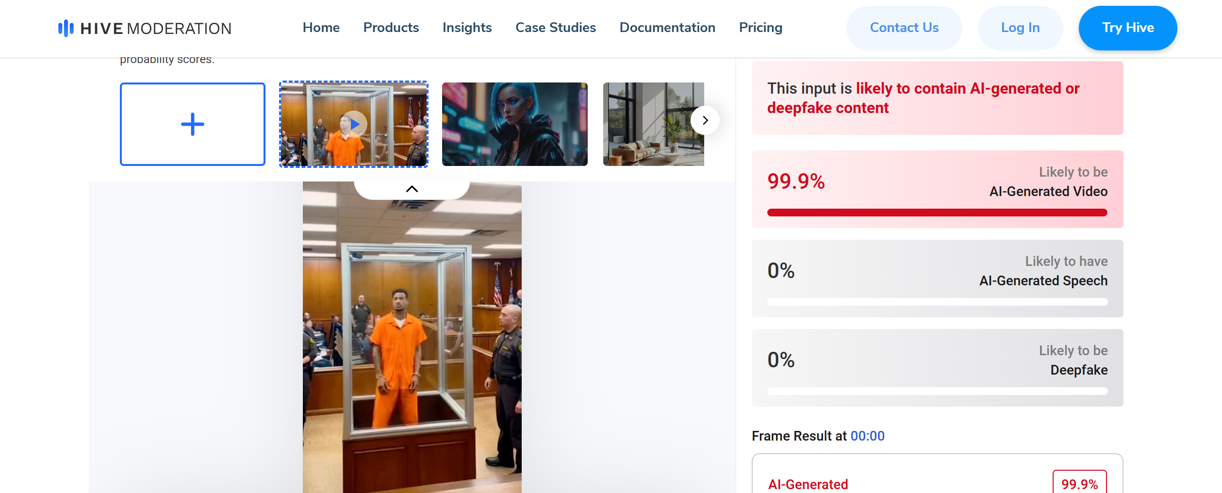 On April 8, 2026, The Hive Moderation AI-Generated Content Detection tool concluded the video was 99.9% 'likely to be AI-generated':