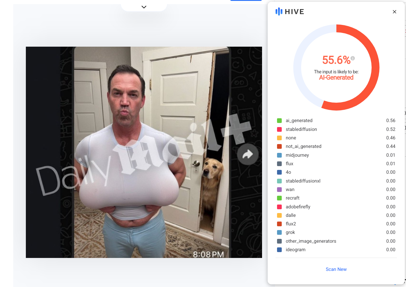 Lead Stories fed the photo into the Hive Moderation AI-Generated Content Detection tool, which concluded the image was "likely to be AI-Generated" with an aggregated score of 55.6 percent. The higher the score, the greater the AI content. Here is a screenshot of the results: