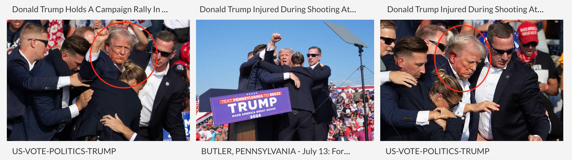 Photo agency Getty Images (archived here) has hundreds of photos of Trump from that day with blood on his ear and face visible, as this screenshot shows: