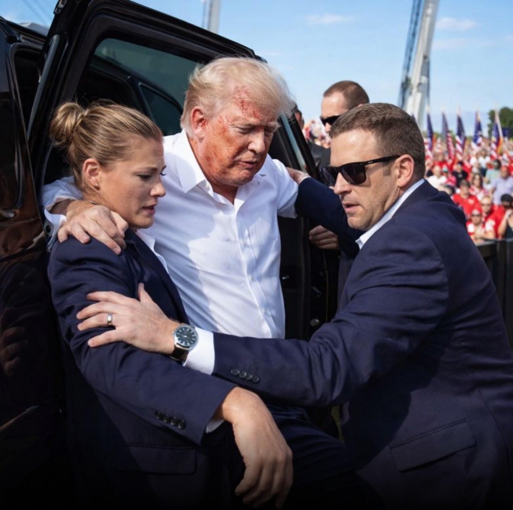 Is a photo that shows Donald Trump with no damage to his ear immediately after the Butler assassination attempt authentic? No, that's not true: An online AI detection tool rated the image as 100% likely AI-generated. The account that originally posted the photo posts multiple AI images. Published images from the day of the assassination attempt show Trump with blood on his ear.