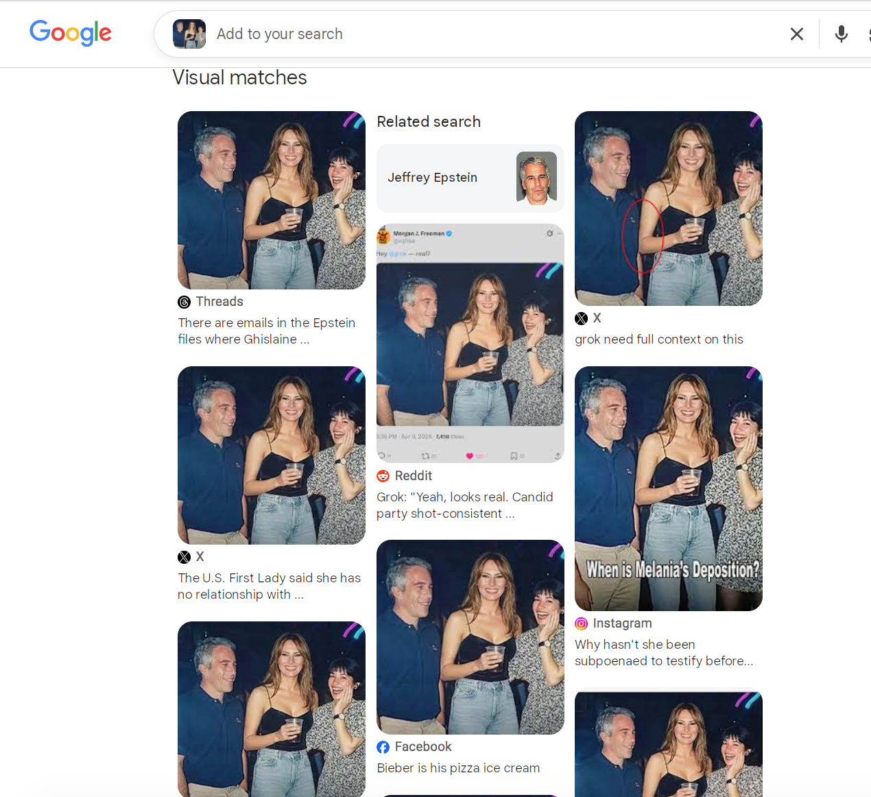 Reverse image searches of the image using Google Images and TinEye returned other social media posts but did not provide any credible evidence that the photograph is authentic.