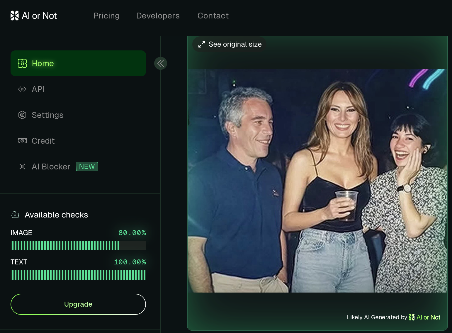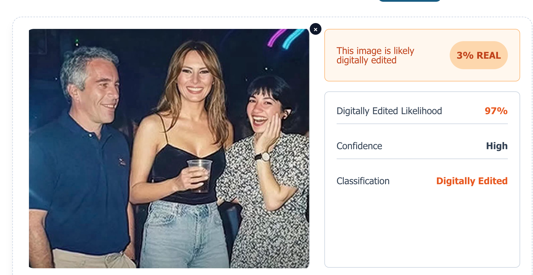 Is a photo that shows Melania Trump smiling and standing next to Jeffrey Epstein and Ghislaine Maxwell authentic? No, that's not true: Online detection tools flagged the image as likely digitally altered and likely AI-generated. One rated it as 97 percent likely to be digitally edited.