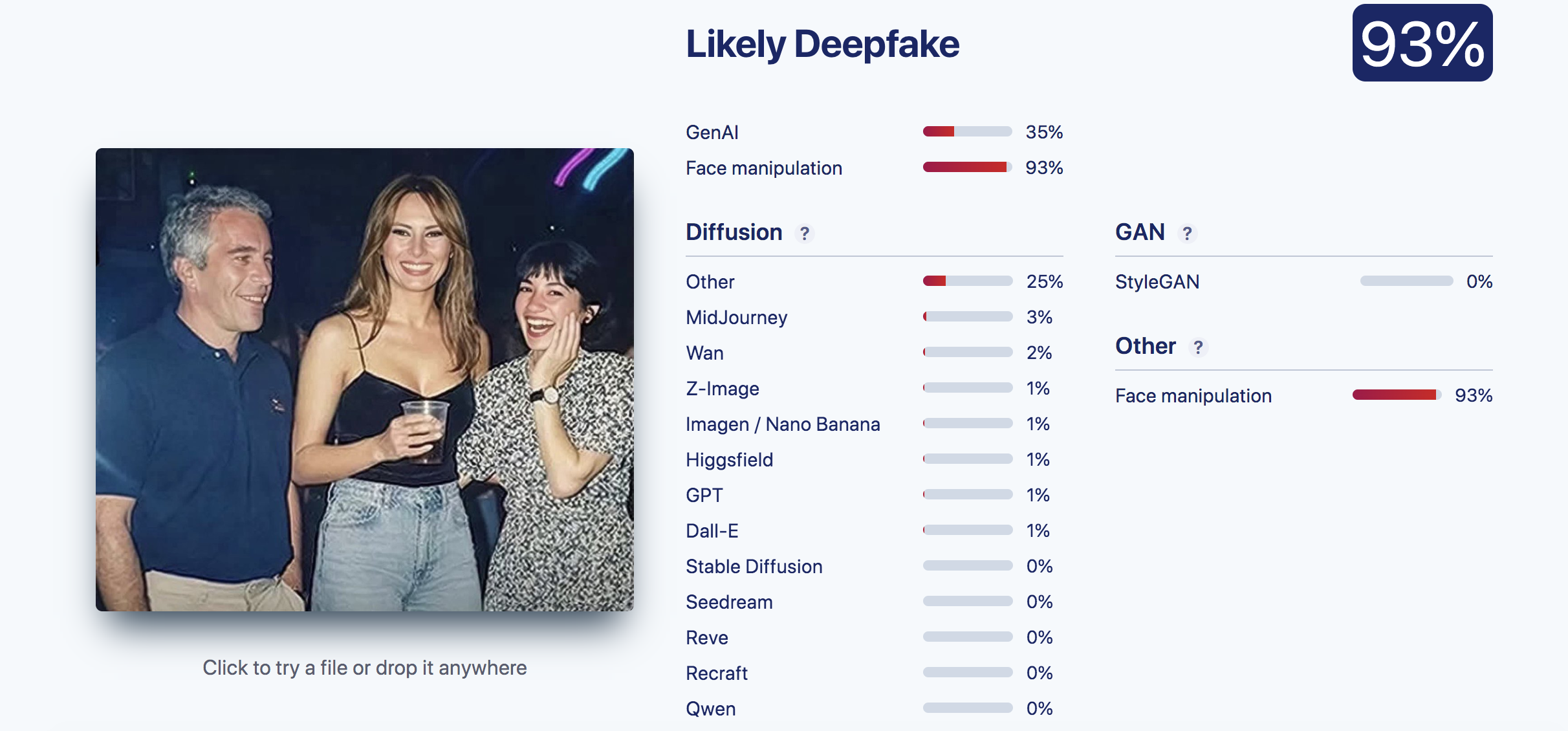 Sight Engine determined the image was 93 percent likely a "Deepfake," with 35 percent likelihood it was AI-generated and 93 percent likelihood of face manipulation, as this screenshot shows: