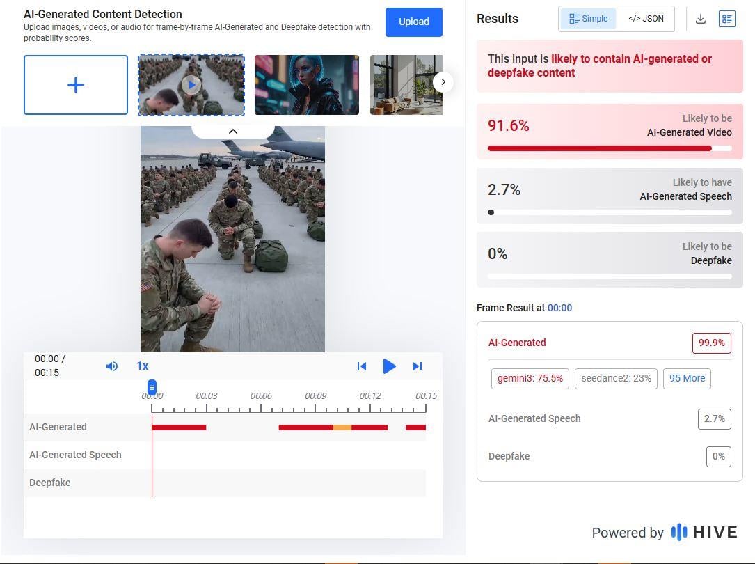 The Hive Moderation AI-Generated Content Detection tool concluded the video was 91.6% 'likely to be AI-generated':