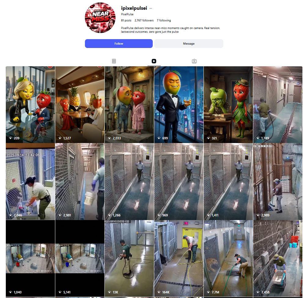 In the thumbnails of the account's reels (archived here, pictured below) there are five videos featuring animated characters resembling fruit. These were all posted on April 15, 2026. More than 50 additional videos posted in March 2026 show scenes from what appears to be the off-exhibit holding enclosures at a zoo. They depict a keeper hosing or sweeping a hall while animals -- including chimps, bears, tigers and wild dogs -- slip out of their enclosures into the keeper's space.
