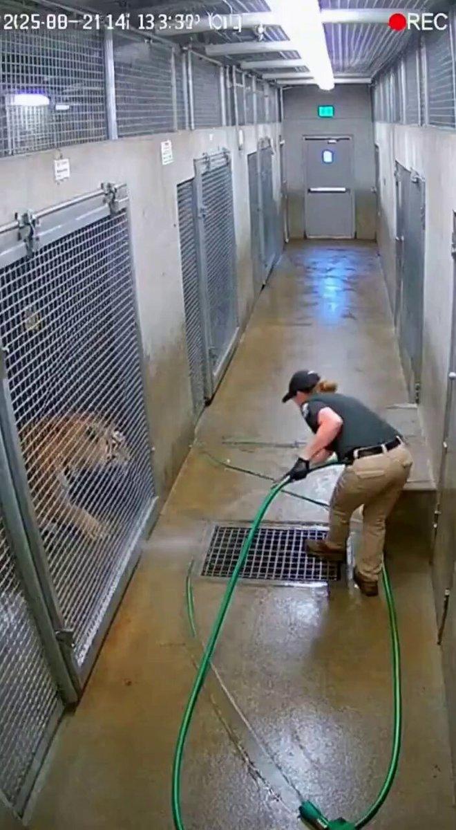 Does a video show a real incident where a tiger escaped its cage while a keeper was cleaning the hall with a hose? No, that's not true: This video is AI-generated. It was originally published on Instagram by an account that posts almost exclusively videos of close encounters between keepers and dangerous animals.