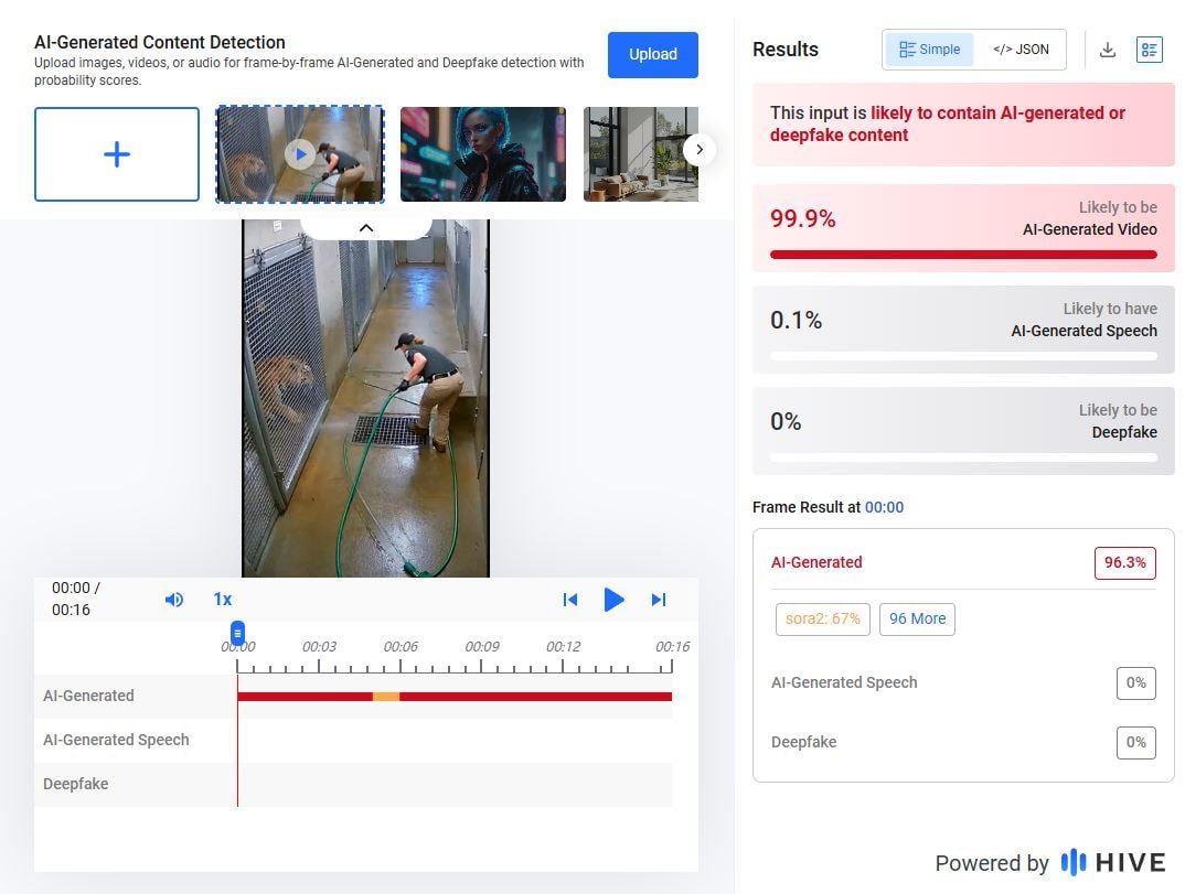 The AI-generated content detection tool at Hive Moderation determined with 99.9 percent confidence that the video was AI-generated. There are also glitches in the video that point to the AI origin, notably the spray nozzle and green hose, which appear to be in pieces yet are still able to spray water.