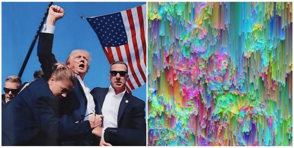 Does an abstract digital image from 2021 contain a hidden image showing the famous raised fist photo from the 2024 assassination attempt against President Donald Trump in Butler, Pa.? No, that's not true: The digital image was presented in 2026 with a transparent overlay so that both images were intermingled. It does not contain a hidden image of the 2024 scene in Butler.