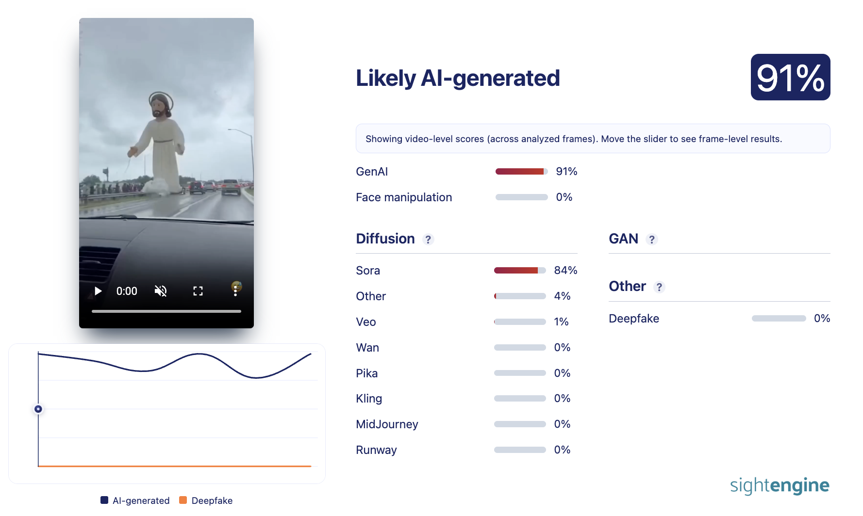 Another detection tool, Sightengine, said the video was 91 percent likely to have been produced by AI: