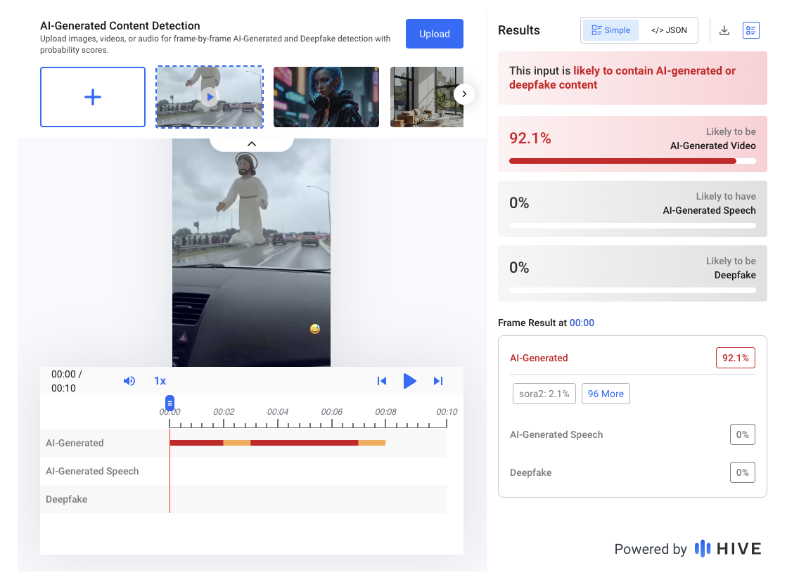 AI detection tool Hive Moderation found that "the video is 92.1% likely to contain AI-generated or deepfake content," as the screenshot of the results below shows: