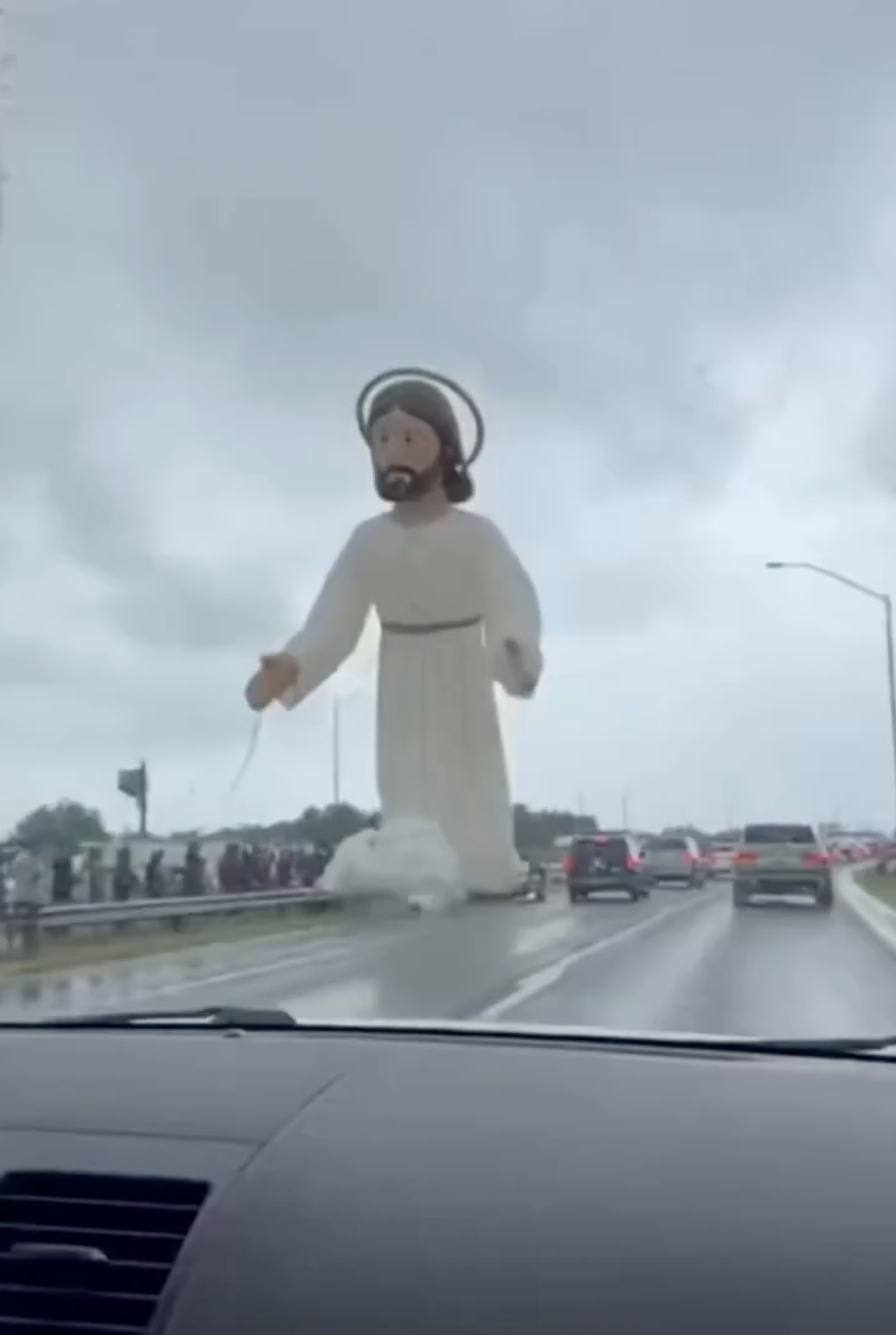 Does a viral video of an inflatable Jesus doll floating in traffic capture a real-life event? No, that's not true: The clip was generated by AI. It was initially posted on social media by an account with a satire label.