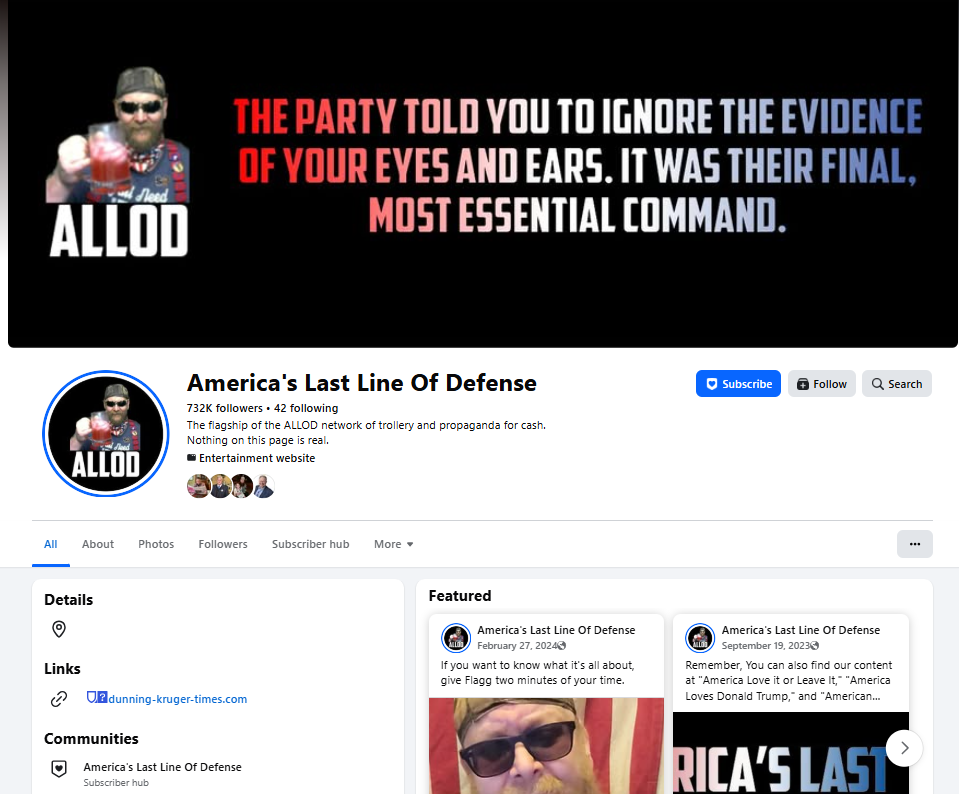 The homepage of the America's Last Line of Defense Facebook account (archived here) mentions it is the "home of the Dunning-Kruger Times" and clearly states, "The flagship of the ALLOD network of trollery and propaganda for cash. Nothing on this page is real," as this screenshot shows: