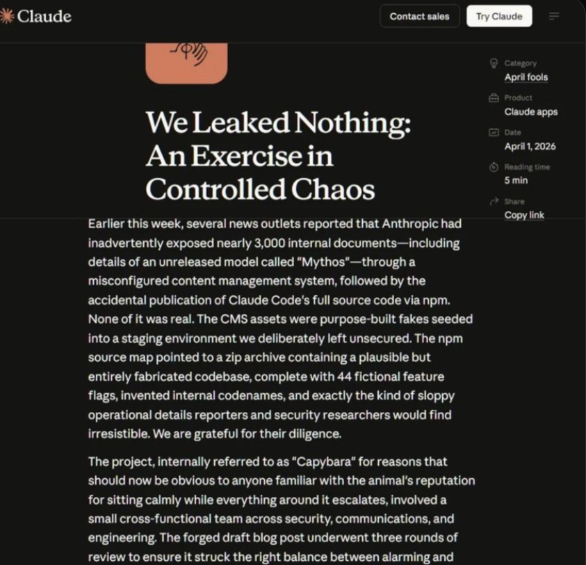 Did Anthropic stage a leak of Claude's code as an April Fools' prank, an "exercise in controlled chaos"? No, that's not true: There was a leak of part of the source code for "Claude Code," Anthropic's AI-powered coding assistant. There is no evidence that the leak was intentional or timed to be an April Fools' joke as stated in a screenshot circulating on social media. A statement from an Anthropic spokesperson acknowledged the error. Actions taken to have the leaked code removed from GitHub demonstrate the leak was neither intentional nor a joke.
