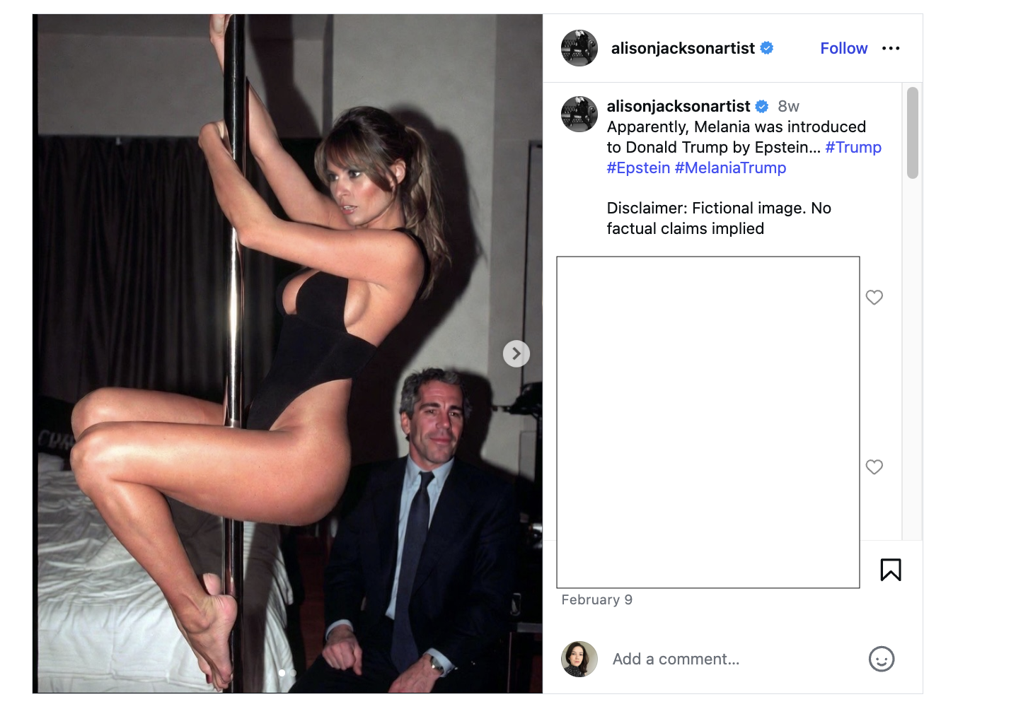 The earliest known version of the picture was published on Feb. 9, 2026, on Instagram, under the caption that, in part, read: