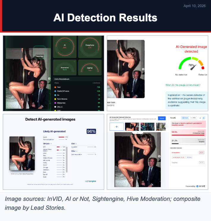 Four AI detectors placed the probability of the image being AI-generated between 76% and 99.9%: the InVID-WeVerify plugin at 76%, AI or Not at 89%, Sightengine at 96%, and Hive Moderation at 99.9%.