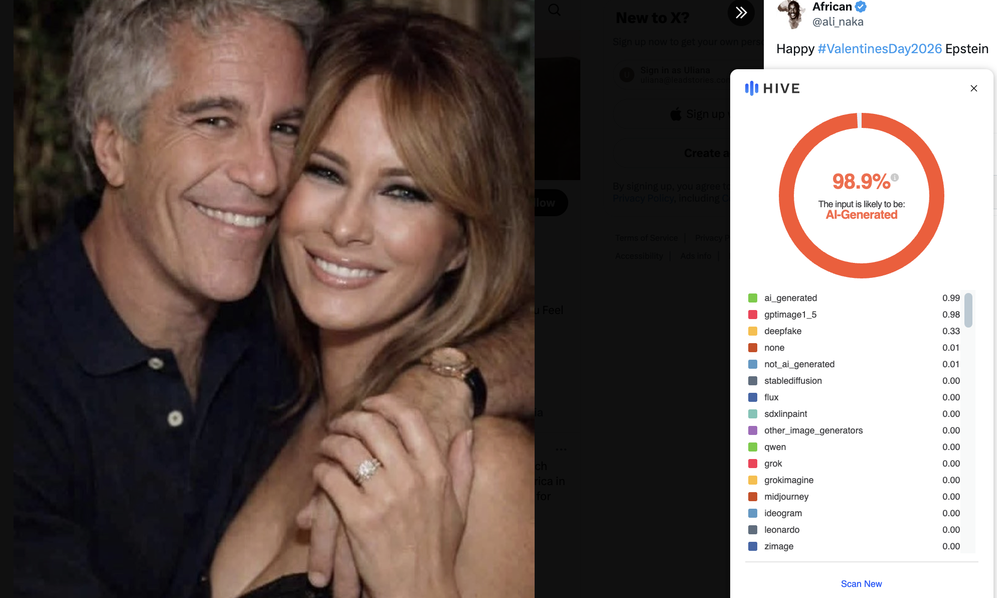 Does a viral image purporting to show Jeffrey Epstein hugging Melania Trump document a real-life scene? No, that's not true: Lead Stories did not find supporting evidence that it's an authentic photo. Two AI detectors pointed to the presence of generative AI in the picture.
