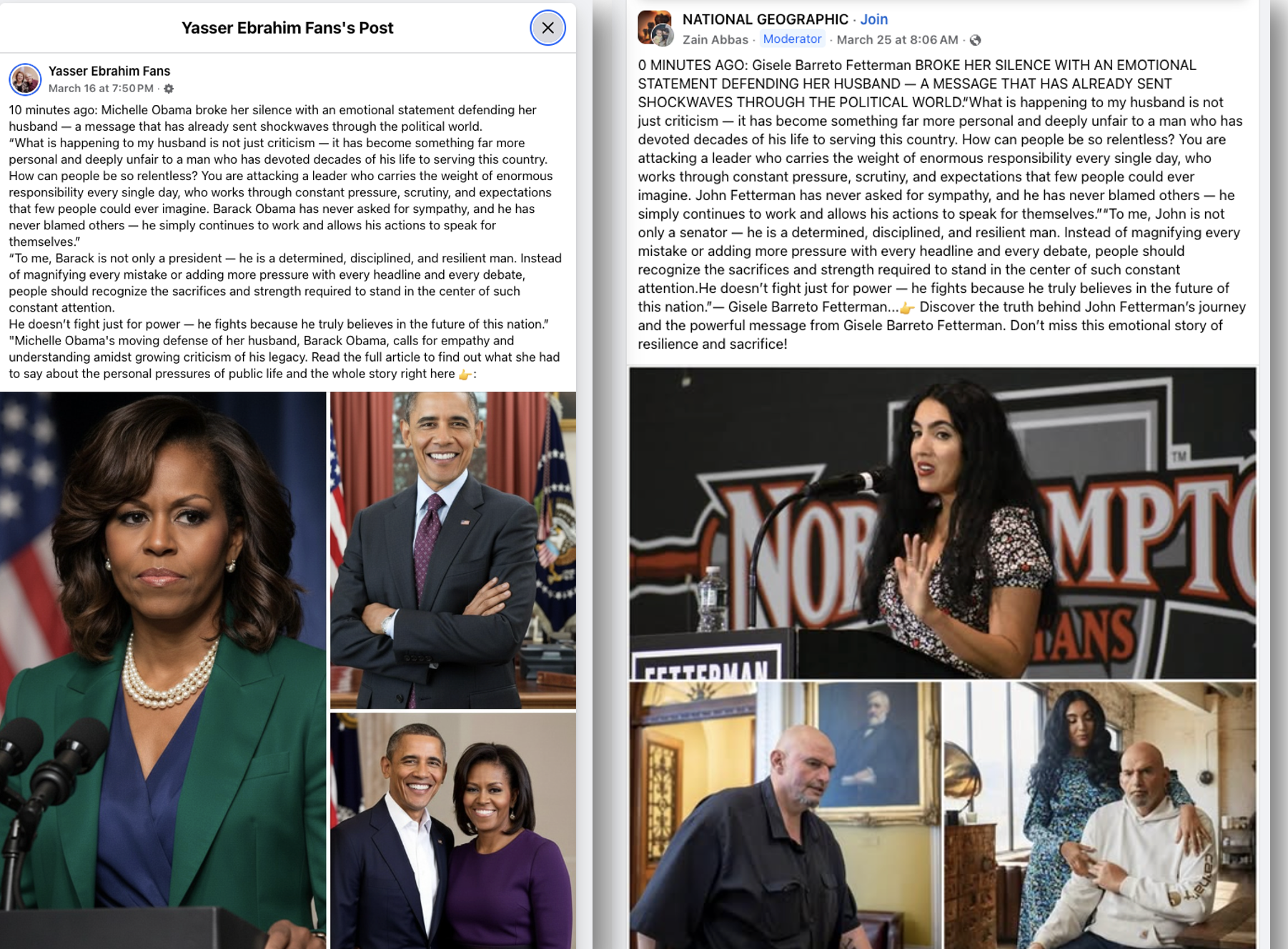 In 2025 and 2026, Lead Stories has documented dozens of cases of "Viet Spam" -- a series of coordinated campaigns targeting celebrities in an obvious attempt to maximize ad revenue through the increased traffic generated by made-up stories. Not only did those sites and accounts display some form of connection to Vietnam -- they published identical or incredibly similar stories happening to multiple public figures at the same time. In this particular case, Lead Stories found variations of the same fake quote attributed to Michelle Obama (archived here) and Gisele Barreto Fetterman (archived here), each making similarly worded 'emotional statements' in defense of their husbands using strikingly similar language while avoiding mentioning any specific event that prompted the purported remarks.