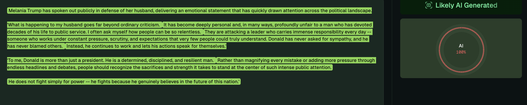 Three online AI detectors, GPTZero, AI or Not and Originality AI, placed the probability of the quote being generated by AI at 100%: