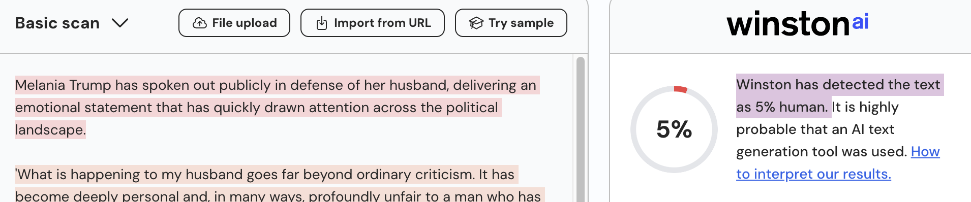 Winston AI, which measures the probability of text being written by a real human, said that such odds in this case are only 5%: