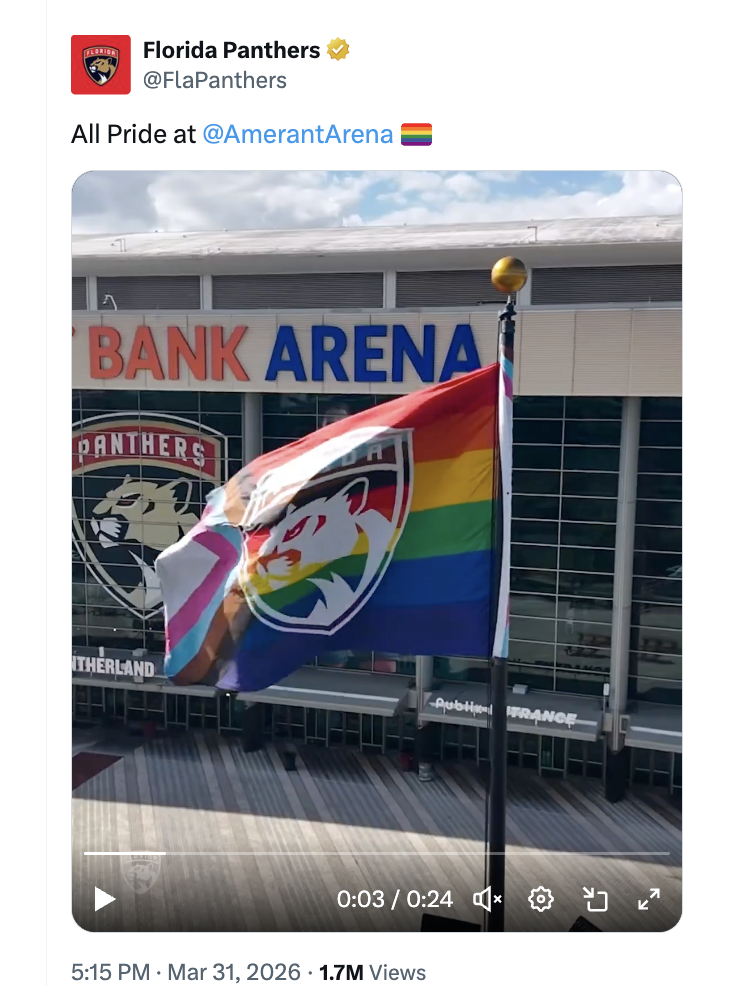 Does a video widely shared on April Fool's Day show a real LGBTQ+ flag waving at an entrance to Amerant Bank Arena, a home stadium for the Florida Panthers? Yes, that's true: The video appeared on the hockey team's account on X, among other places. News reports confirmed that the flag was seen during the March 31, 2026, game.