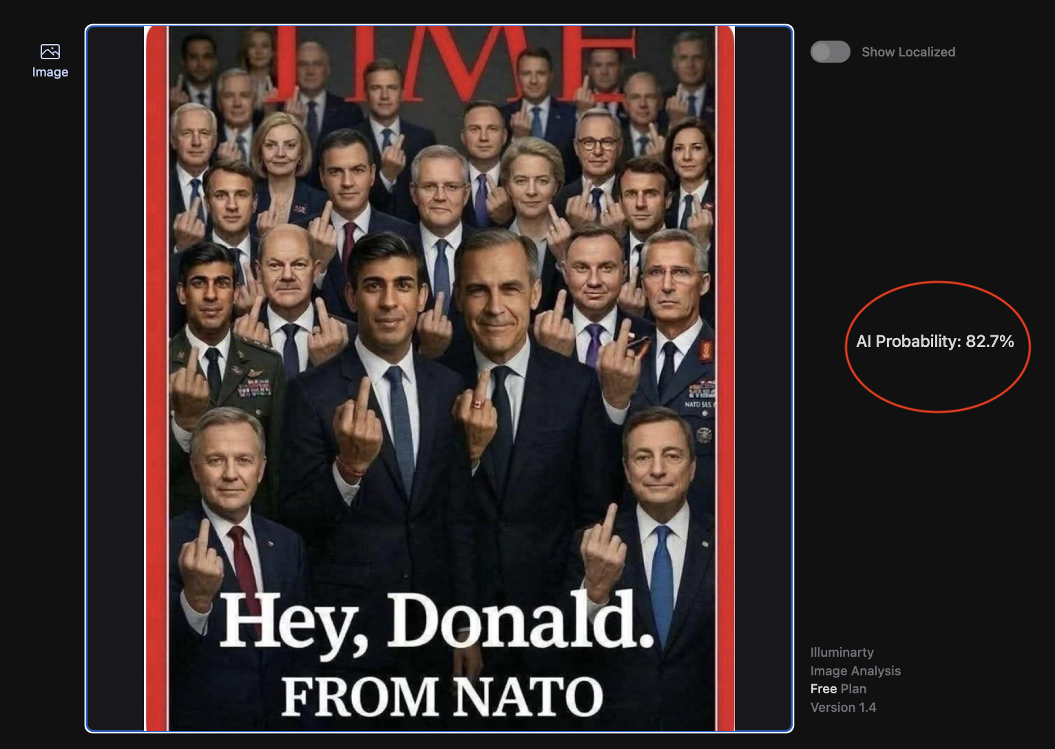 Another AI detector, Illuminarty, concluded there was an 82.7 percent "AI Probability" for the image: