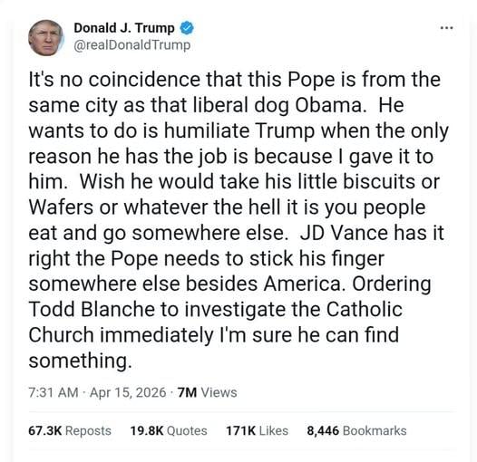 It's no coincidence that this Pope is from the same city as that liberal dog Obama. He wants to do is humiliate Trump when the only reason he has the job is because I gave it to him. Wish he would take his little biscuits or Wafers or whatever the hell it is you people eat and go somewhere else. JD Vance has it right the Pope needs to stick his finger somewhere else besides America. Ordering Todd Blanche to investigate the Catholic Church immediately I'm sure he can find something.