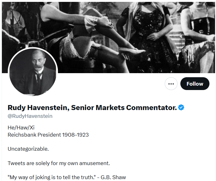 The profile description of the @RudyHavenstein account (archived here) said that its posts were for amusement.