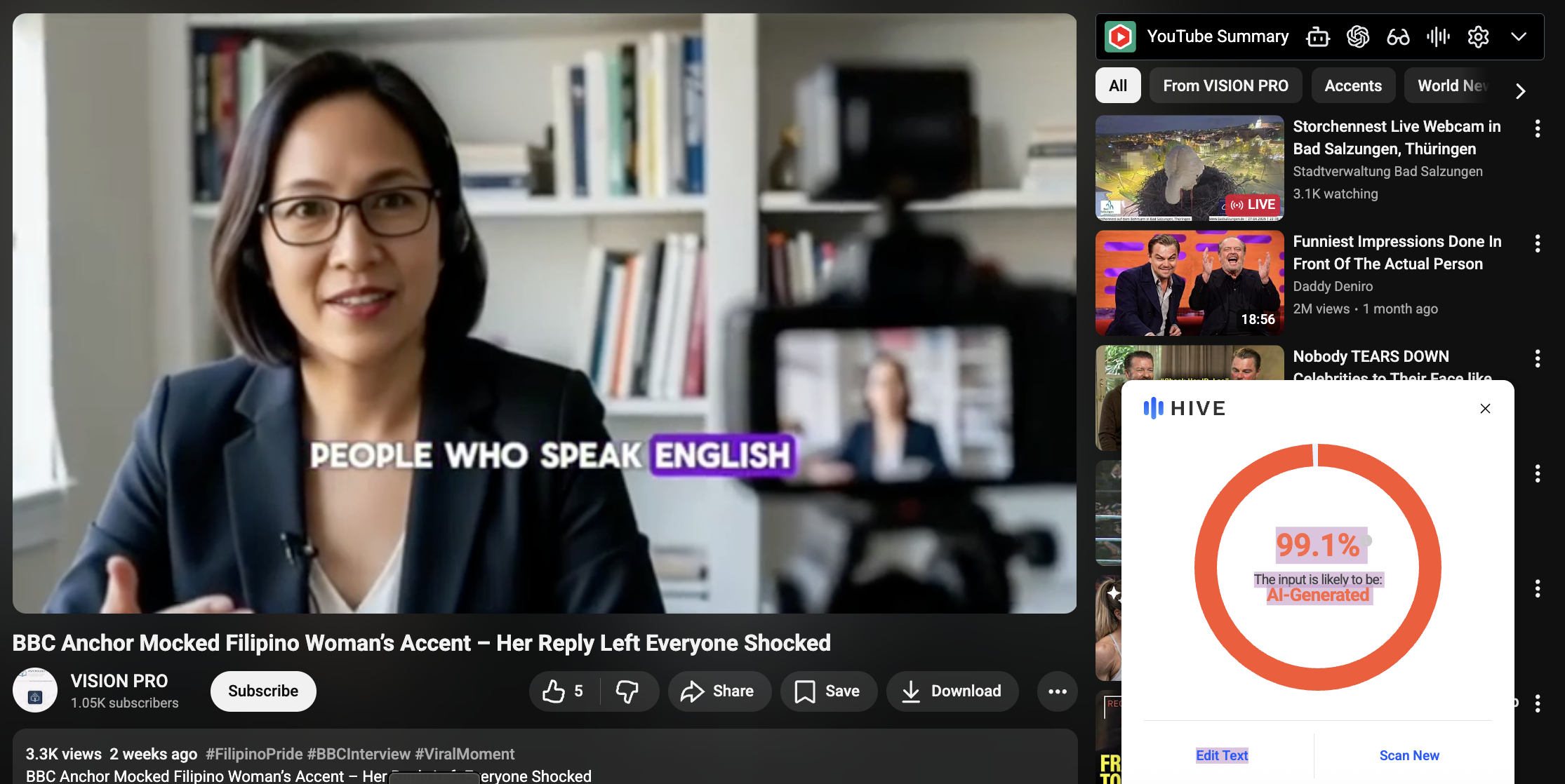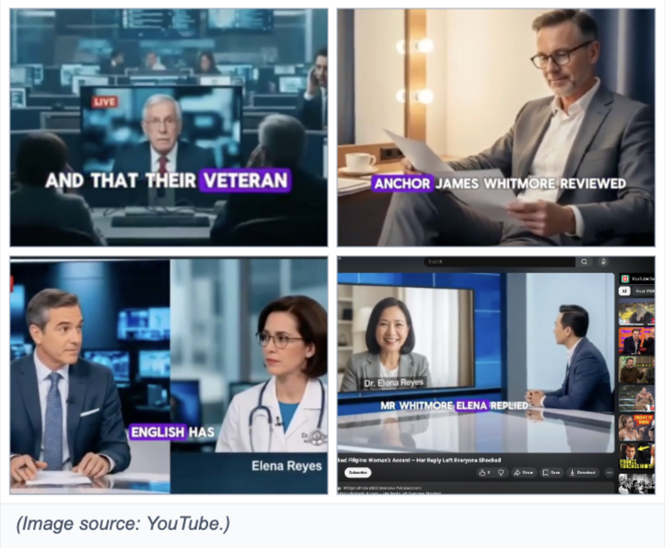 Does a viral video on YouTube discuss a real-life scandal involving BBC host "James Whitmore" mocking Filipino Doctor "Elena Reyes" for her accent? No, that's not true: The story was made up by AI. Multiple online tools detected AI across different elements of the story, and the BBC website showed no record of either the host or the guest.
