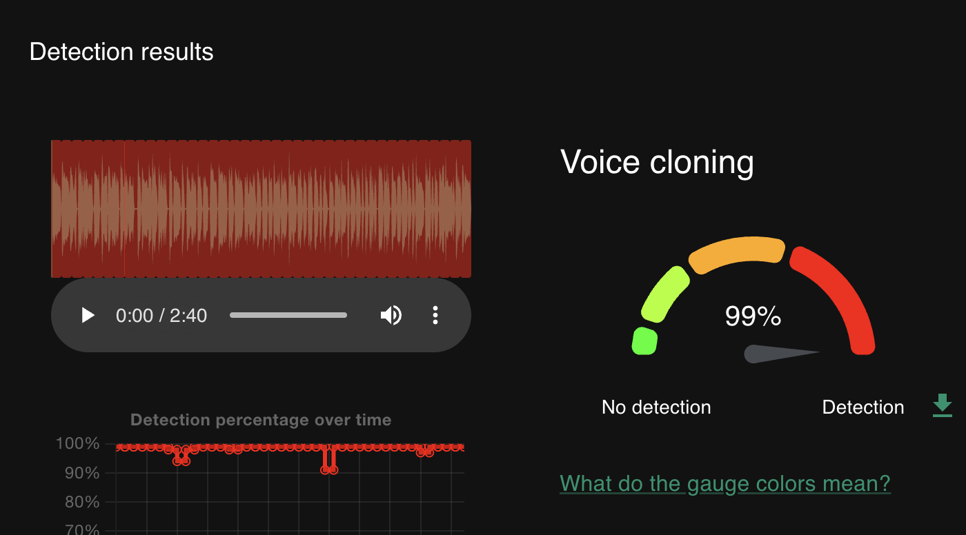 The Hive Moderation plugin said that the content of the narration was 99.1% likely to have been produced by AI: